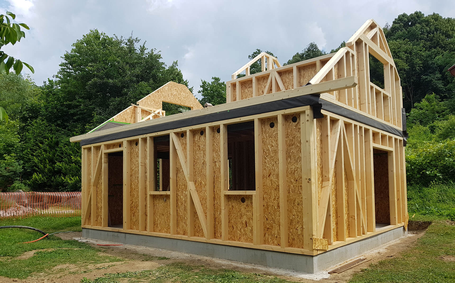 CNC računalno upravljani stroj, temeljen na skeletnim kosturnim planovima, obavlja precizno rezanje drva koje naši monteri grade na mjestu kao lego kocke. Tako dobivaju kostur ili skelet kuće. Na jednoj strani kostura stavljamo ploču od drvenih vlakana, a na drugu paropropusnu OSB 3 ploču. Celulozna izolacija se strojno ugrađuje unutar skeleta kuće. Na unutarnjoj strani postoji samo instalacijski kanal, jer instalacije nisu predviđene unutar skeleta, već unutar toplinske ovojnice. To je korisno jer paropropusna ploča(OSB 3)